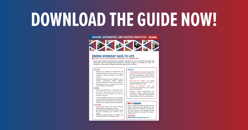 Discover how Avaap’s secure, automated integration seamlessly connects Workday to Snowflake—enabling unified analytics, enhanced reporting, and AI/ML capabilities. This downloadable guide outlines the challenges of cross-platform data integration and how Avaap’s pre-built accelerator saves time, ensures data security, and delivers scalable insights. Perfect for organizations looking to maximize the value of their Workday data.